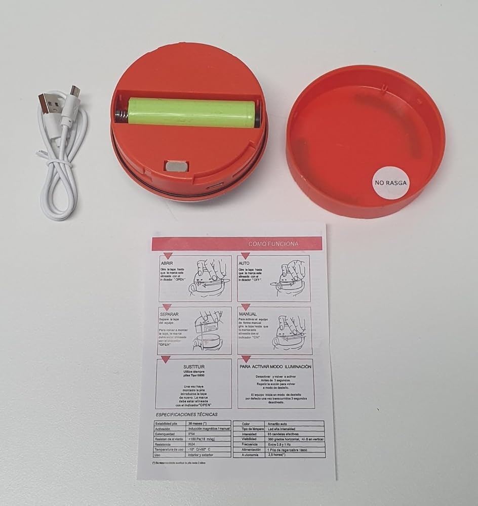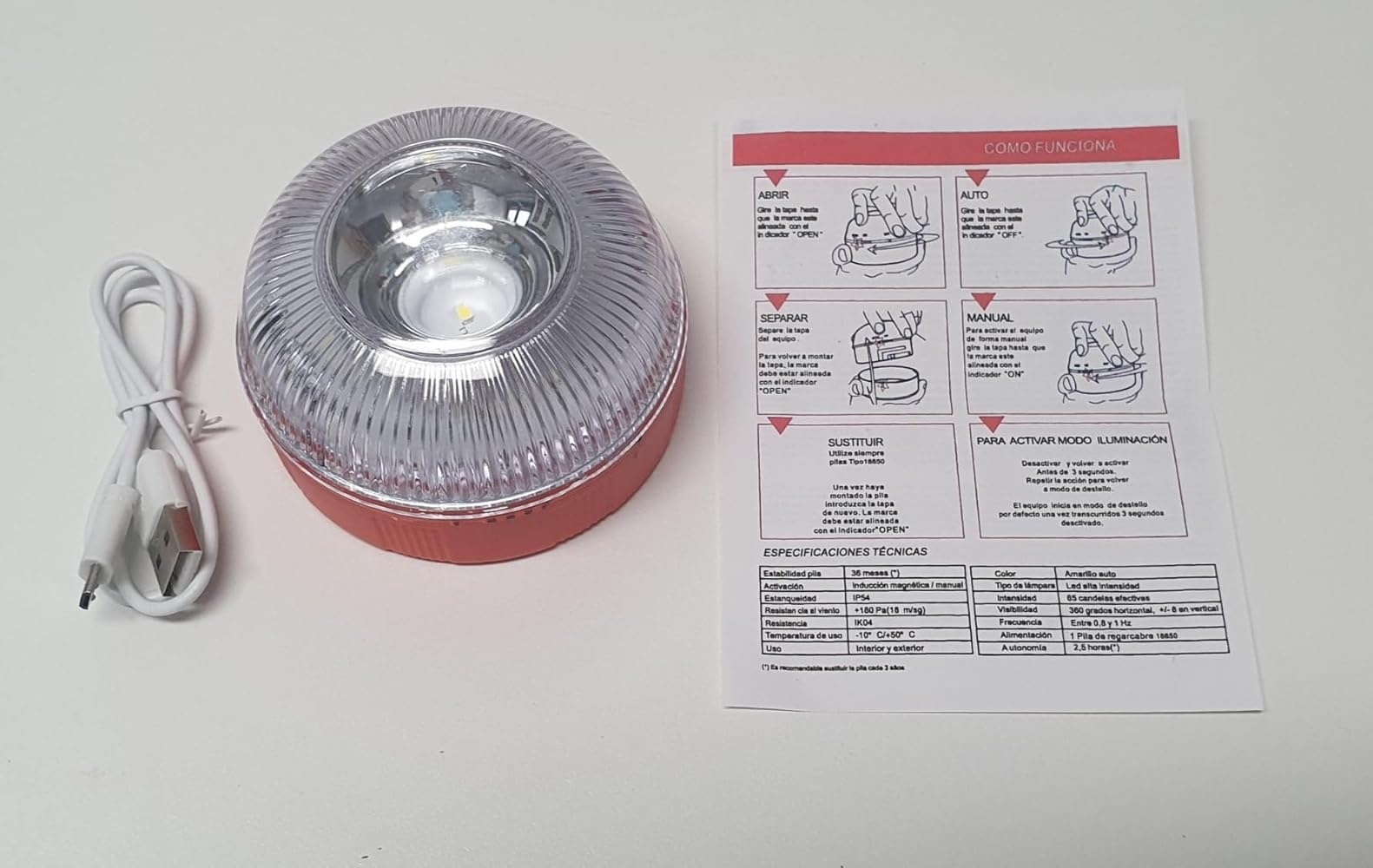 Buena relación calidad-precio.El destello de la luz amarilla es muy luminoso y, en modo luz blanca fija como linterna, también tiene buena potencia.Las instrucciones sí vienen en español (lo digo por otros comentarios que he visto que indican lo contrario).La pila viene con su precinto de plástico para que no se desgaste en almacén.El indicador de recarga por USB cambia a color verde una vez completada la carga.El encendido automático por contacto con superficie metálica funciona perfectamente.Al ser envío Prime llegó al día siguiente de la compra sin problemas.No le doy 5 estrellas porque cuesta trabajo abrir y cerrar la tapa para acceder a la pila y al puerto USB de recarga, da la sensación de que si hacemos más fuerza se puede partir.En resumen, buena compra.