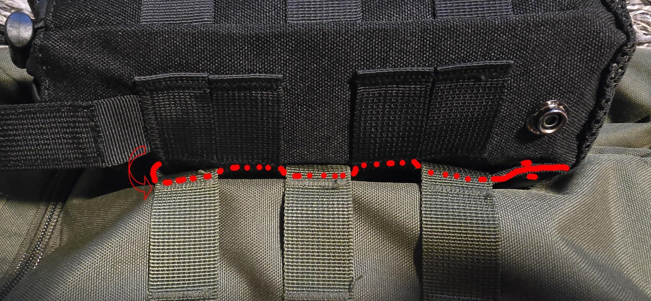 I primarily grabbed this for the water bottle holder, but the other gear is also useful. The squat bag can barely hold a mobile phone in a billfold wallet case. The taller bag is still too short to hold a folding cane and zip shut. Unlike the shorter bag, it doesn’t have a loop of 25 mm webbing to attach a Grimloc D-ring, whish is my usual trick for when something doesn’t quite fit in those bags, such as my first aid kit and rescue shears. For that bag, I ran the zipper pulls through the Grimloc so they would still stay closed, even with the scissors’ handles protruding. This taller bag instead is topped by two standard D-rings, the non-opening kind, so I used one of the elastic tie downs to secure the cane and zippers.