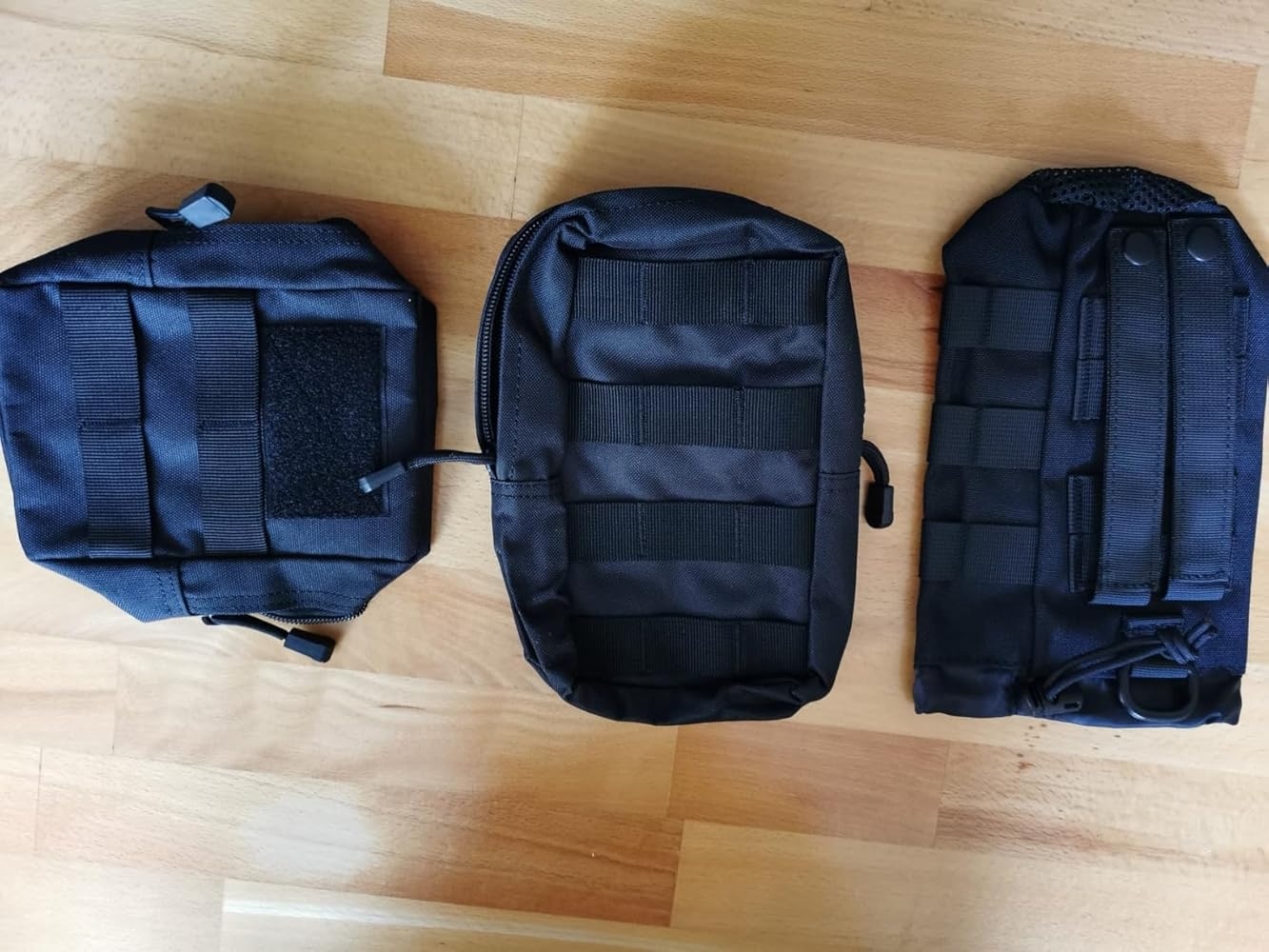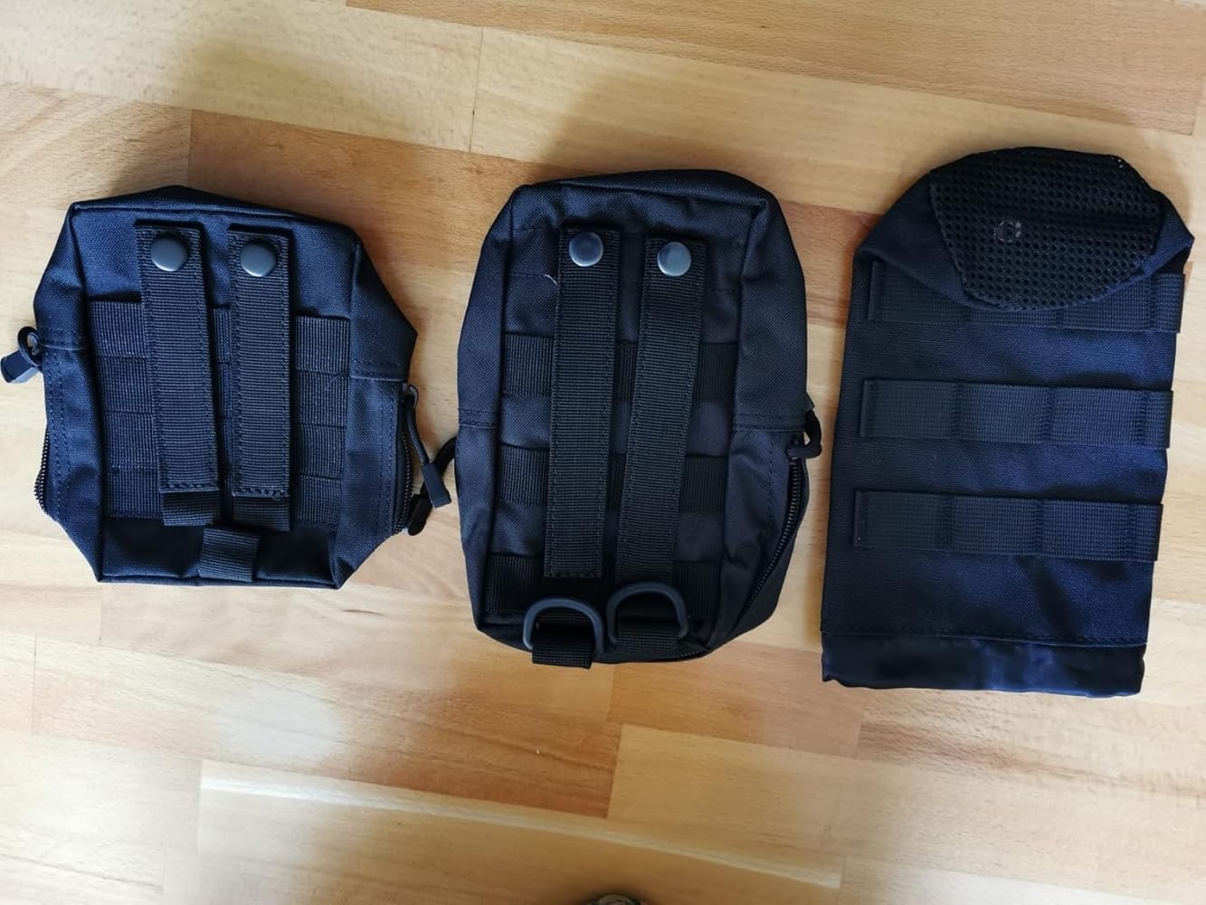 Lieferumfang:⭐⭐⭐⭐⭐5/5- 2 taktische Taschen- 1 Trinkflaschentasche- 3 Gurtbandclips- 2 Gurtbandhaken mit Schlüsselring- 2 Befestigungsschnallen- 3 D-Haken- 2 KarabinerPreis:⭐⭐⭐⭐⭐5/5Bei namhaften Herstellern bezahlt man für das gleiche Set locker das 3-fache!Verarbeitung/Qualität:⭐⭐⭐⭐⭐5/5Sehr robustes 1000D-Material. Ist Standard bzw. sollte Standard sein in diesem Bereich. Saubere Nähte, leichtgängige Reißverschlüsse, stabile Molle Stripes…so habe ich mir das vorgestellt. 👍Funktion/Handling:⭐⭐⭐⭐⭐5/5In die Flaschentasche passt perfekt eine Nalgene 1000ml Trinkflasche rein, gibt es auch hier auf Amazon. Alternativ auch 2 Gaskartuschen mit je 500ml oder 1 Gaskartusche + Brenner. Die kleinere der beiden Taschen eignet sich z.B. für ein MedPack. Die 3. Tasche für allerlei EDC oder was man sonst so mit sich rumtragen möchte.Die zugehörigen Haken und Karabiner sind qualitativ gut, wobei man die beiden kleinen Karabiner gegen stabilere austauschen könnte. Auf meinen Fotos seht ihr, wie die mitgelieferten Haken am Molle befestigt werden.Auf einem weiteren Foto seht ihr, wie die Molle Stripes ineinander verwoben werden um die Taschen z.B. an einem Rucksack mit Molle befestigen zu können. Hierzu gibt es auch Videos auf z.B. Youtube.Fazit:⭐⭐⭐⭐⭐5/5Bombe!! Für mich als Bushcrafter ein must have! Für diesen Preis, in dieser Qualität, mit dieser Ausstattung müsst ihr lange suchen bis ihr was vergleichbares zu diesem Preis findet! @Amazon, bitte mehr davon 👍👍👍✅Uneingeschränkte Kaufempfehlung meinerseits! ✅