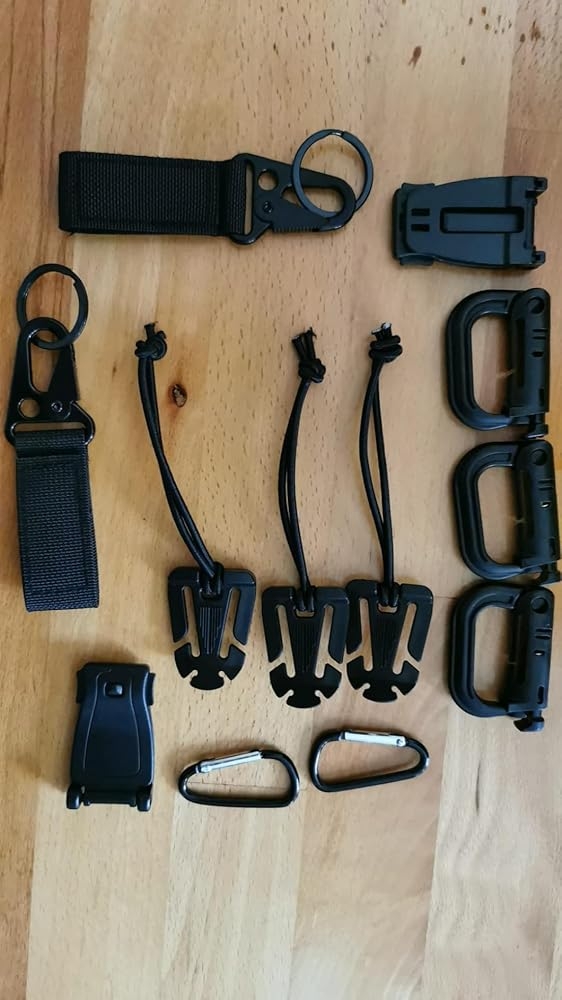 - Amplia gama de juegos: el juego incluye 2 bolsillos tácticos, 1 bolsa para botella de agua, 3 clips de correa con goma elástica, 2 ganchos para correa con llavero, 2 hebillas de fijación planas, 3 hebillas de plástico en D, 2 pequeñas hebillas de metal
