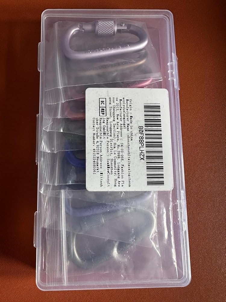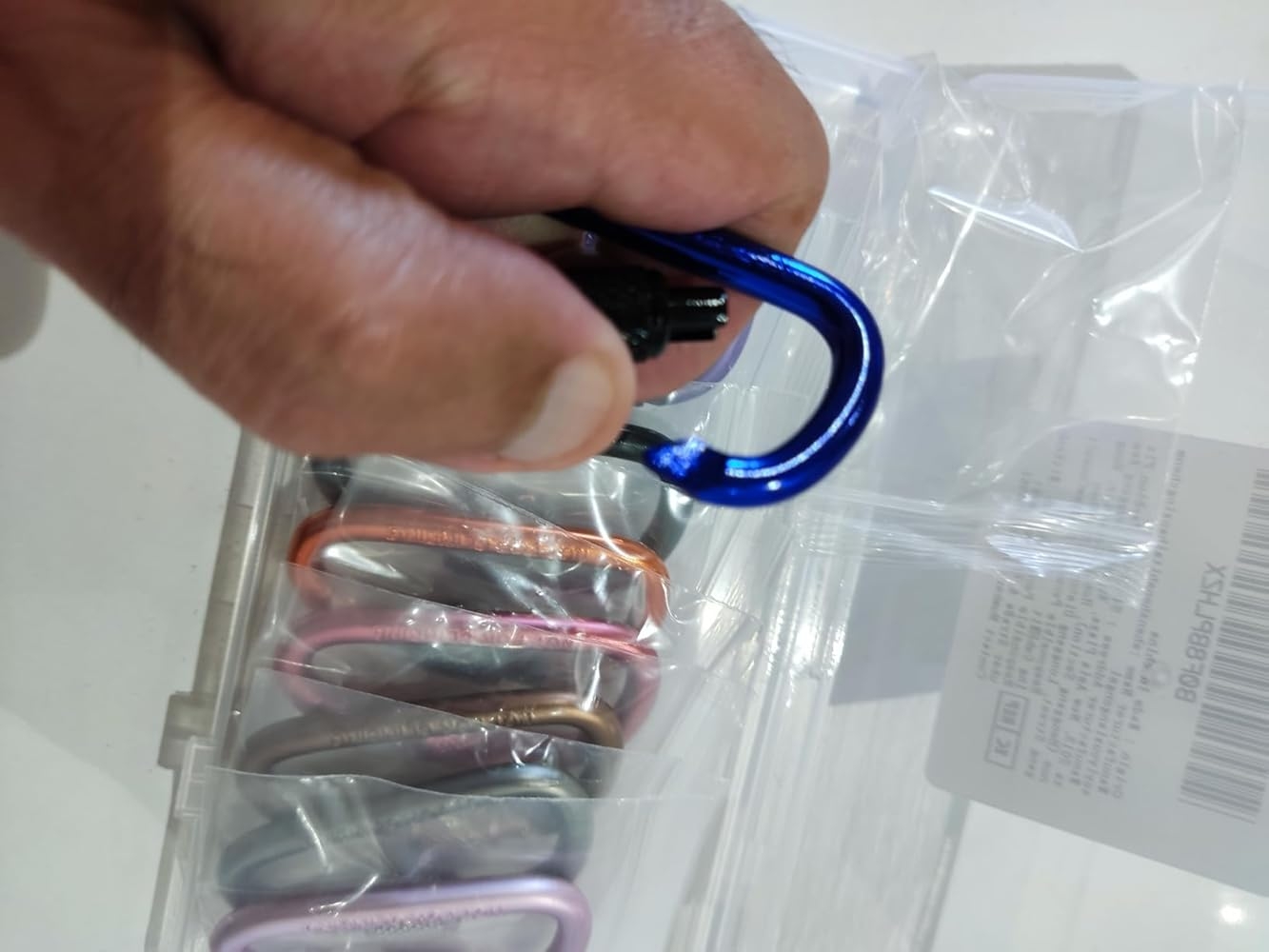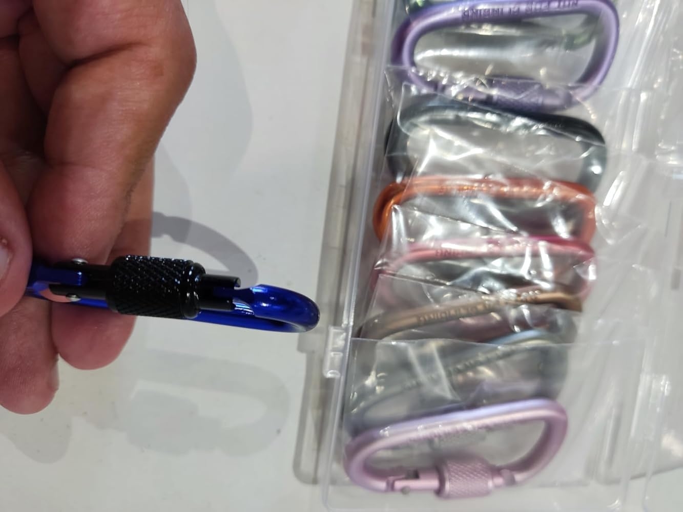 Son 10 mosquetones, pintados en colores brillantes y llamativos, pero de tamaño medio – pequeño (en las fotos del anuncio parecen más grandes).Son muy ligeros y todos tienen seguro de resaca.Solo útiles para tareas ligeras, como llaveros o colgar cosas de peso ligero.La pintura tiene pinta de que no va a aguantar mucho al sol directo, por lo que no veo para permanecer al aire libre de forma permanente.