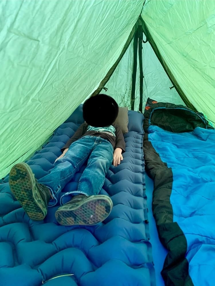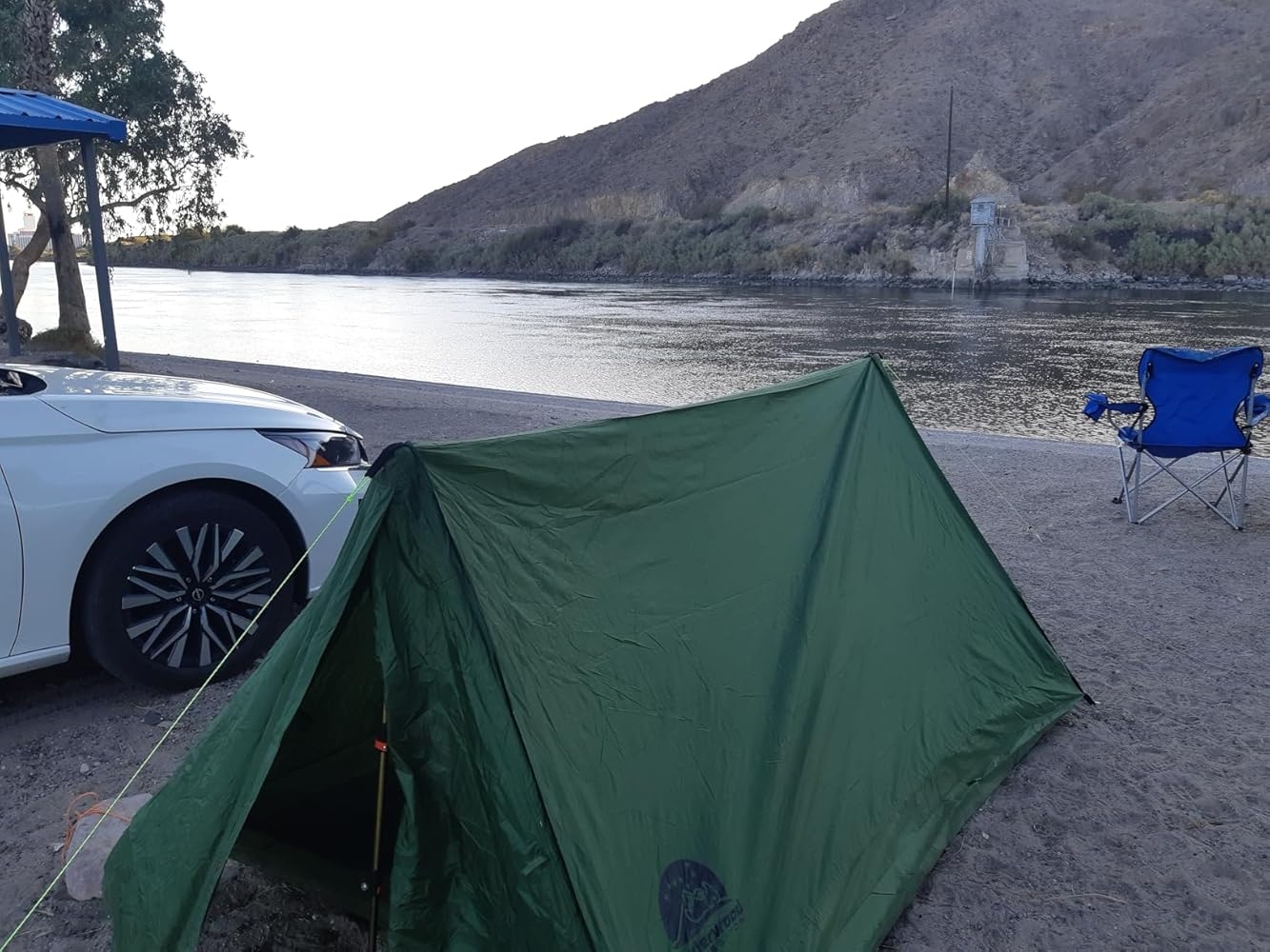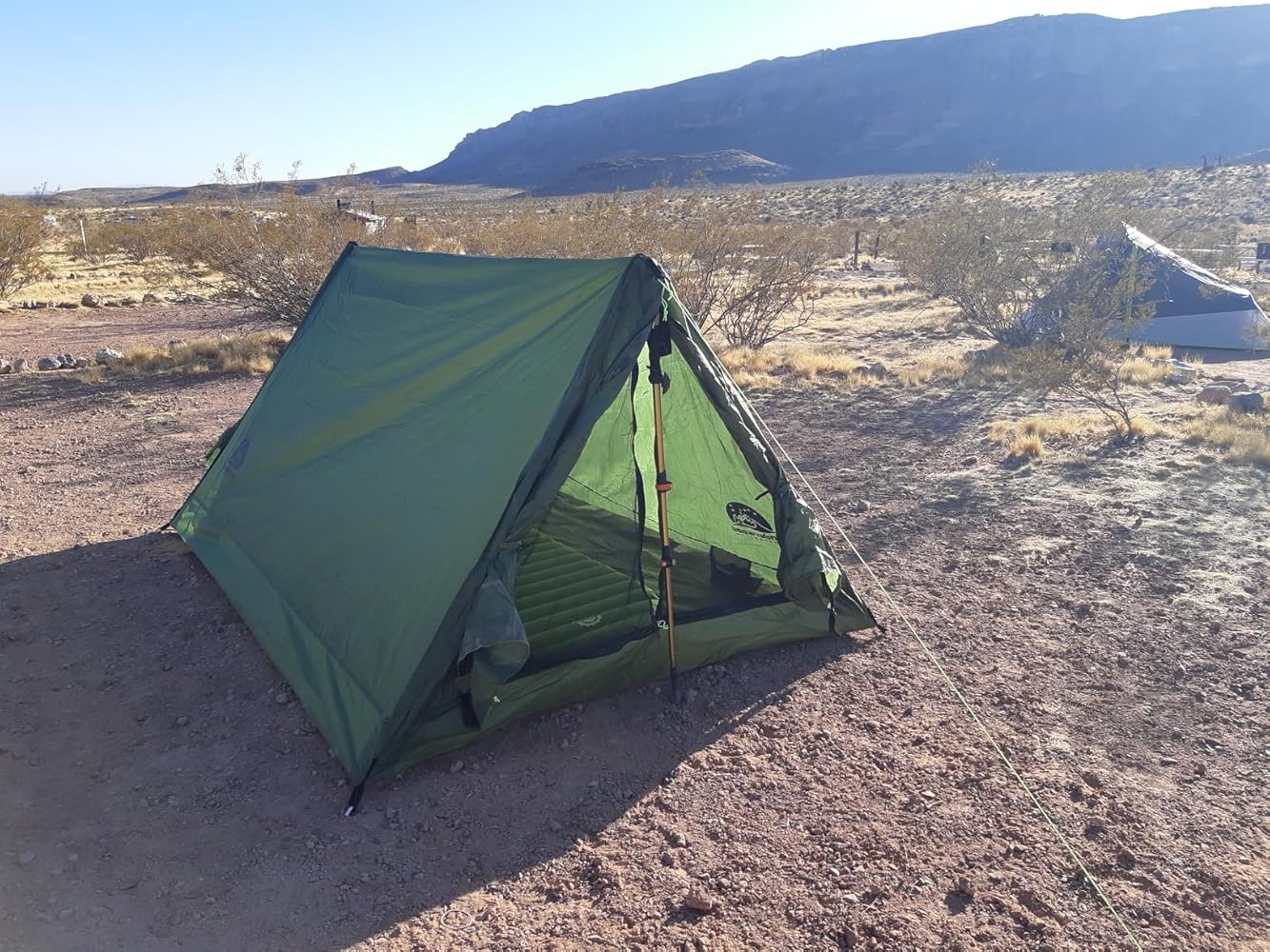 I spent days trying to find an affordable, lightweight tent for backpacking. Unless you shell out $300+ you’re not going to find anything. That is, unless you’re fortunate enough to stumble onto this little bad boy. This thing is high value. As the picture shows, it’ll comfortably fit two. I actually did two trips with myself and two kids (that’s three). We had to lay sideways, but it wasn’t too bad. The design is simply outstanding: great stitching, quality material, well thought-out zippers. The pegs are a nice, lightweight aluminum. It takes 5 or 6 minutes to setup and is lightweight enough to take backpacking. We did a 10-miler with this very comfortably. What’s the catch? There really isn’t one. Basically, it just doesn’t have a frame. It uses a long paracord-type string that you can either (1) connect to two trees either side of the tent with a truckers hitch knot (kind of like setting up a hammock), or (2) you just place your hiking poles or a sturdy stick you find laying on the ground on either entrance to the tent. When you stabilize the sticks by pegging down your guide rope, this thing is as sturdy as any $300-500 REI special. Because it’s so simple, there’s less that can break. I’m thinking of switching out all my tents for two or three of these. If you’re backpacking or just tent camping at a campsite, this will serve you very very well.