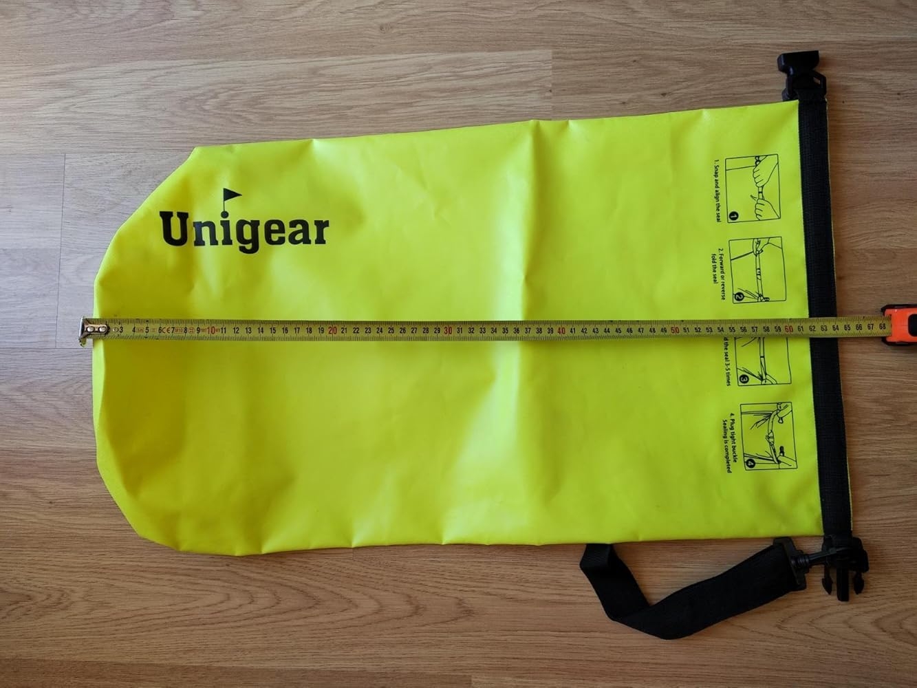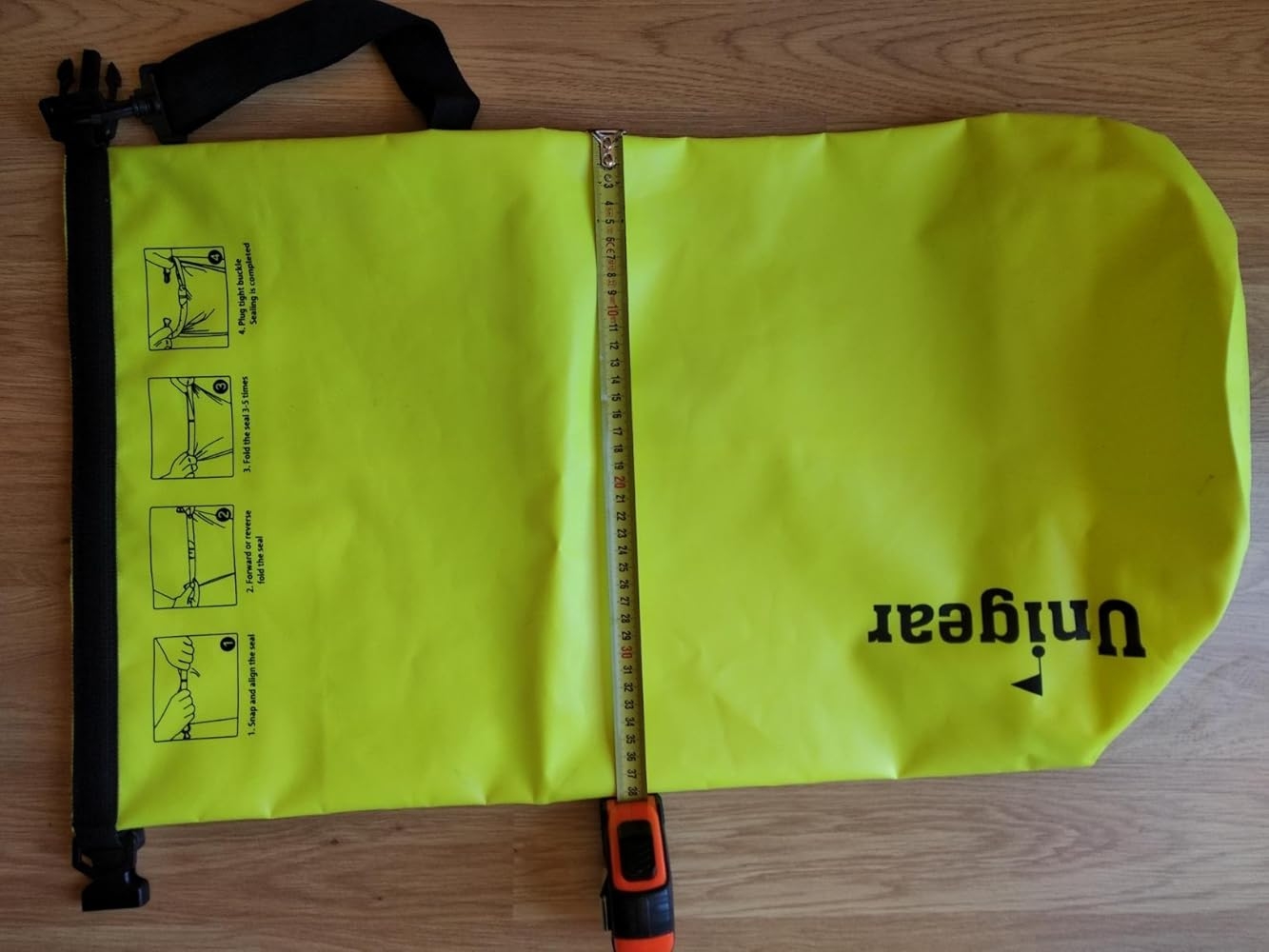 Me ha gustado bastante ya que buscaba algo estanco pero tiene varios problemas, el primero es que no puedo cerciorarme de su estanqueidad ya que aún dándole 5 vueltas al cierre, como dicen, perdía aire de dentro así que no me la he jugado mucho sumergiéndola, sobre todo me ha valido para la playa para que no se mojen las cosas y no entre arena. Por otro lado y es para mí lo más incómodo, es que la versión de 20 litros solo trae un asa para llevarla y te revienta literalmente el hombro si llenas únicamente una tercera parte de su capacidad. En las imágenes sale con dos asas y eso da pie a confusión.Decir también que la opción de 20 litros veo que es la ideal si quieres llevar tanto muchas cosas como pocas, ya que si quieres llevar pocas solo basta con darle más vueltas al cierre y listo, su tamaño mengua a más de la mitad de su tamaño original.Lo dicho, muy práctico para días de playa y viajes pero si quieres que sea estanca 100% me buscaría otras marcas más caras